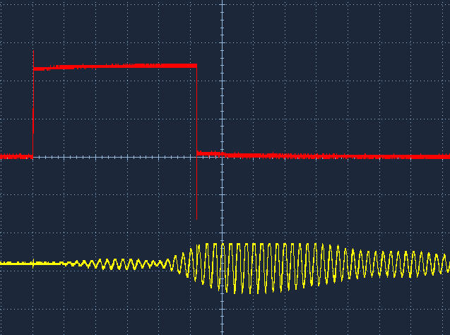 This screen shot shows the result of pointing the HC-SR04 into the void, no objects in range. Red is the final amplifier output, yellow the echo pin. Everything visible is the direct pulse from transmitter to receiver. At 200 μs per division, this lasts for 1.2 ms; one can observe that to get rid of this effect the sensor target distance has to be over 200 mm. Seeing this explains the time varying threshold used on the HC-SR04's comparator. Echoes from distant objects will return a voltage less than the direct signal, the HC-SR04 has to be able to detect them, but it must not trigger on the direct signal. The solution is a threshold which prevents triggering on low level signals until the direct pulse has decayed.
