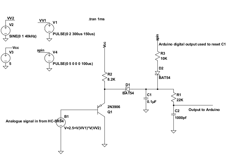 HC-SR04 envelope detector circuit, David PillingHC-SR04 envelope detector simulation, David PillingHC-SR04 envelope detector measured results, David Pilling