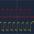 'Scope results, channel 1 and 2 1V per division, time 100 μs. In the first the red signal is the trigger input, and yellow the echo output. The transmit transducer is driven by anti-phase signals, call them P1 and P2. The hardware is running from 3.3 V and worked, it is apparent the amplitude of the transmit signal is limited to the supply voltage.