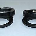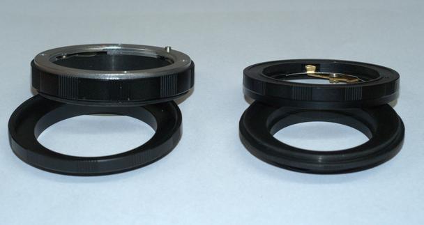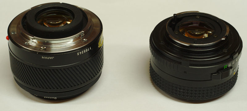 MAMDIn 2006 Sony took over the Minolta brand of cameras, renaming it Alpha and retaining the existing Minolta auto-focus lens system, based on the so called A mount used by MA series lenses. Earlier MC and MD lenses use the incompatible SR mount. It is possible to get adapters that allow the use of MC and MD lenses on MA cameras. This page describes my experience. There are plenty of sources of information about the history of Minolta and the capabilities of the lenses. The little I cover here is stuff I've not seen elsewhere. I have a Minolta MD 50 mm f1.7 lens. Focus is manual, it has an aperture mechanism, which is not supported by the adapters. Use on the Sony Alpha 200 requires the camera to be in M manual mode. Focusing and aperture can be set by hand on the lens, exposure time has to be manually set on the camera. All this is a lot more difficult than using an MA lens where everything can be automatic. An MA to MD adapter positions the lens differently relative to the camera sensor, this means it will no longer focus at infinity, the effect is similar to adding a tube extension to use the lens for macro/close-up work. Adapters come in two types "no glass" aka "macro" which can't focus at infinity, and those with a correcting lens which fixes things up so that the full range of focusing works. Photos of the MD 50 mm f1.7 lens (right), compared with the later AF version (left). Click on small pictures to display large version. Photos show MA MD adapters, version with built in lens on the right. Grid is 10 mm. Notice the hole in the version with glass in is a lot smaller. First photo is of the end which goes in to the camera, second photo is the end the lens fits in. The interesting facts are that with the no glass adapter the minimum focus distance is 18 cm from the front of the lens, the maximum focus distance is 27 cm. For the adapter with a lens the minimum focus distance is 35 cm, and this is the same as for the AF lens. The no glass adapter is therefore not much use for general photos, if one was expecting a maximum focus distance of a couple of meters then one would be disappointed. But it does make a useful macro lens. Another way one might consider connecting MA lenses to MD is via sets of macro tubes. These consist of tubes that screw together allowing various lengths to be formed, at one end there is a lens mount, at the other the connector that fits into the camera. The first photo shows the MA version on the left and the MD on the right. Potentially this would let lenses from other mounts be used, since these tube sets are available for other systems. But as the second photo shows, there is a snag. Firstly the tubes have different threads, 60 mm for the MA, and 57 mm for the MD. Although 57 and 60 mm filter threads are not the most common, adapters are easily available. The second and worse problem is that the sets have opposite male/female threading. The MA camera mount has a female thread, the MD a male, and the corresponding difference at the other end. To connect an MA lens to an MD camera one would need a 60 57 mm male male filter ring connector. The third photo shows that this can be constructed from common parts. From left (MA) to right (MD), a 60 - 58 ring, a 58 - 55 ring which screws into the 58 mm end of a 55 - 58 ring followed by a 55 - 57 ring. The trick here is that the 55 mm thread on a 55 - 58 ring runs all the way through, allowing it to be used as a 55 - 55 male male ring. Photo 4 shows the 58 - 55 and 55 - 58 rings connected together and photo 5 shows the thread on the 55 - 58 ring. Other filter rings that have a 3 mm difference have threads running all the way through and can be used in this way. Female female filter rings are common, they're used for reverse mounting lenses for macro work. This example (MA lens on MD mount) is the opposite of the commercially available connectors at the start of the page (MD lens on MA mount). However the same conversion as the commercial connectors allow is possible with a lens reversing ring - but would be longer, reducing the maximum focus distance. |